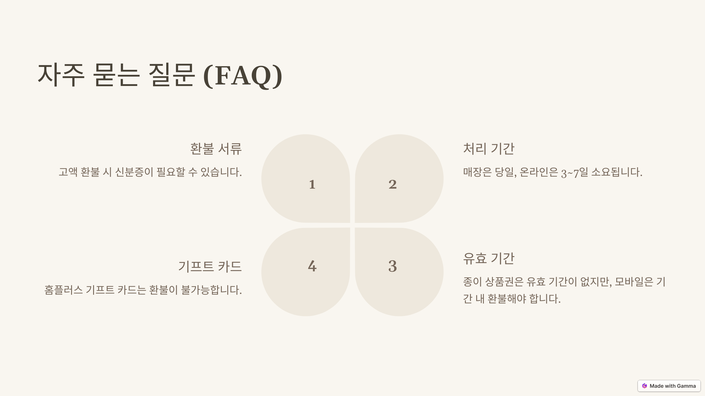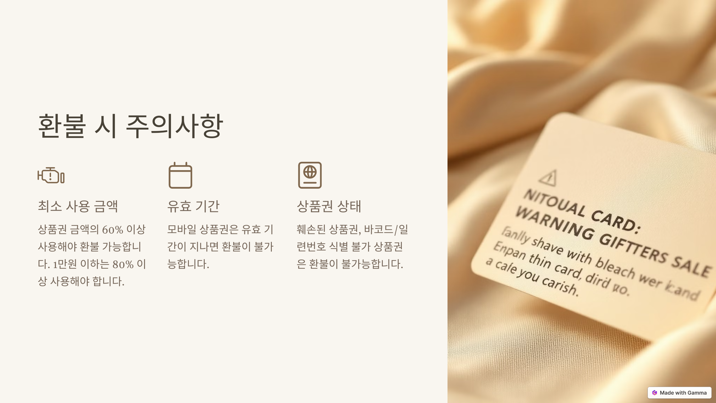 | ❌ 환불 불가 조건 | 훼손된 상품권, 상품권 번호 식별 불가, 일부 사용 후 환불 |
